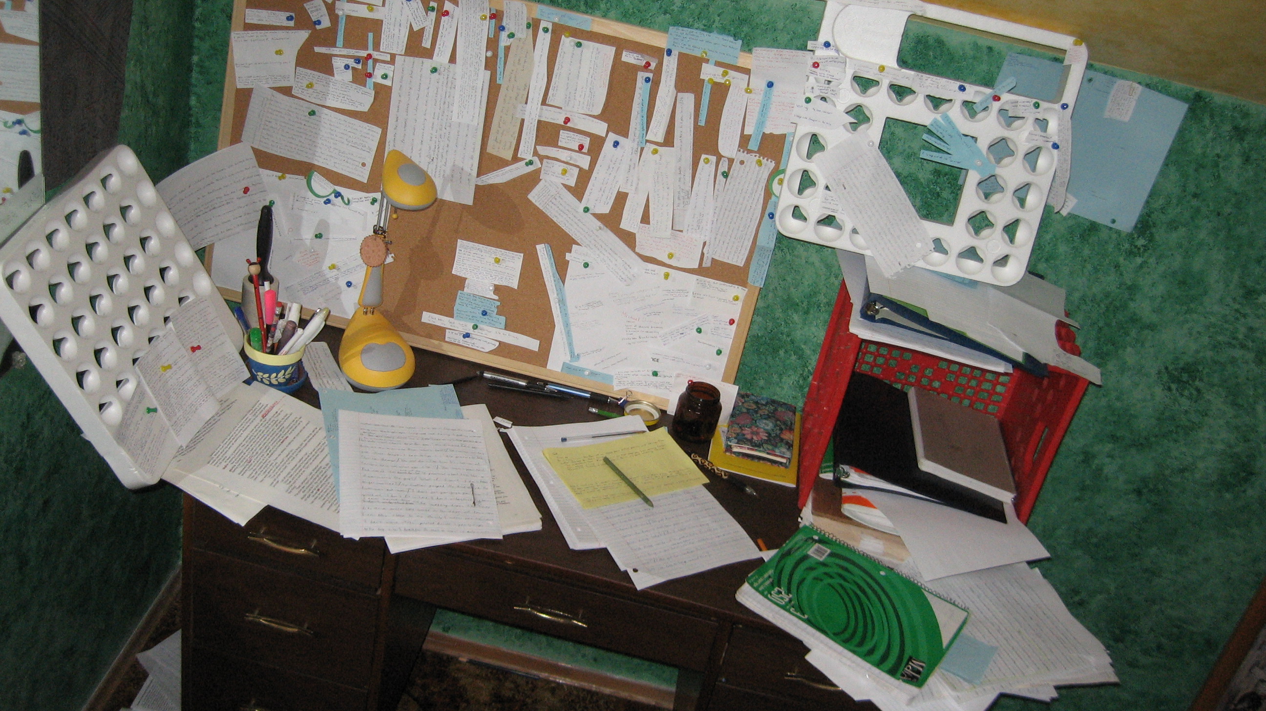 As you can see from the picture, my organizational system for keeping track of the plot of my novel is getting unwieldy. (For comparison, see the picture in this post). On the plus side, I am one tenth of the way through! The trick now is to not bog down in the middle part, but to keep my excitement going all the way to the end. I can’t believe I wrote a novel in eight weeks once, it seems to be taking a lot longer this time around.